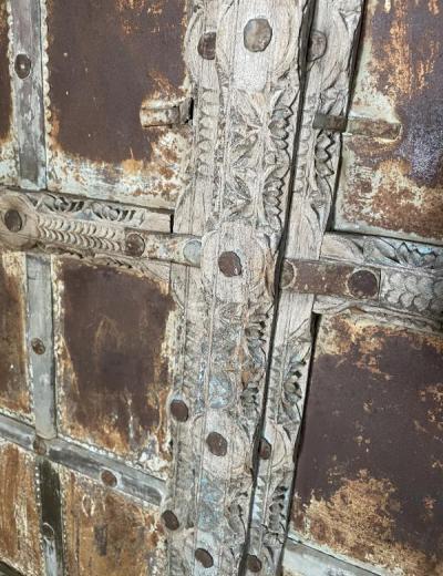 Prachtige houten luik met metalen elementen.